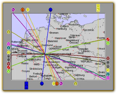Ob private oder geschäftliche Reisen, sobald man den Standort wechselt unterliegt man neuen Einflüssen, die von persönlichen astrogeographischen Konstellationen abhängen. Wo viele Planetenlinien verlaufen, können entsprechend viele Kontakte gepflegt werden. Der Verlauf der Jupiterlinie (blau) zeigt z.B. Regionen, in denen man mit Erfolg, Unterstützung und guten Gelegenheiten rechnen kann. In Regionen, in denen kaum oder keine Linien verlaufen, könnte man sich schwertun, etwas zu erreichen oder die Kontakte auch zu halten und langfristig zu pflegen.